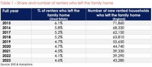 Hamptons Chart 1 - share of renters who left family homeBut in the last five months that figure has fallen to 4.6% – around 43,280 new rented households in England this year (see chart 1 and table 1).